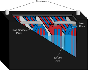 Car batteries have six cells stored in a plastic case. Inside the cells are plates made of lead and lead dioxide, layered together and submerged in sulfuric acid. A chemical reaction occurs between the plates and the acid electrolyte, generating the electrons that flow from the battery and power your vehicle’s components.
